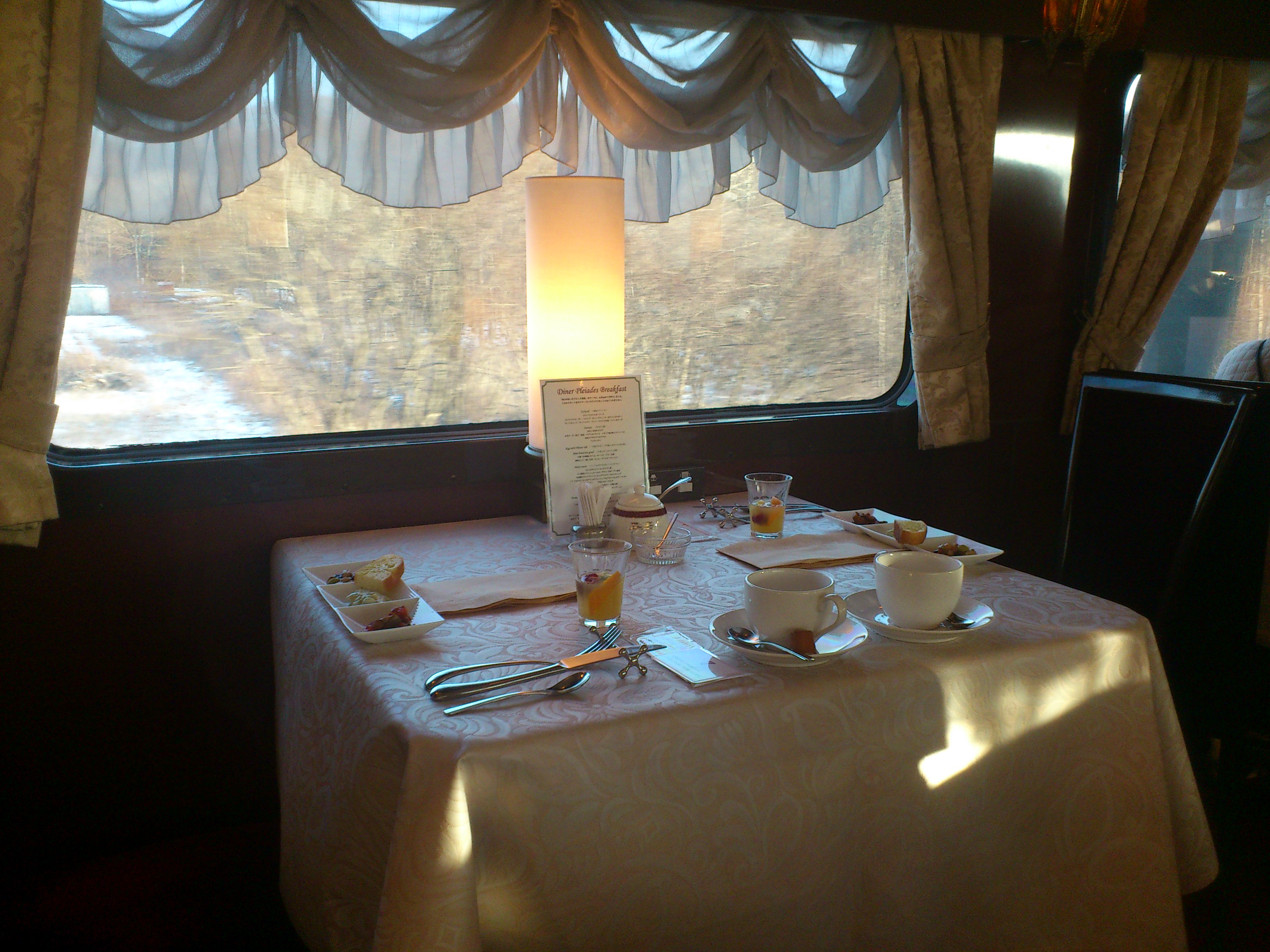 トワイライトエクスプレスな1日 茅ヶ崎営業所の榎本です。 つい先日、日本一長距離を走る寝台特急「トワイライトエクスプレス」に乗車しました。写真が中心になってしまいますが、その様子をご案内します。 トワイライトエクスプレスは、大阪~札幌間(約1500キロ)を結ぶ寝台特急。 約22時間をかけて札幌までの列車の旅となります。 しかし、この列車も3月に廃止になることが決定しているので、 おそらく最後のお別れ乗車となるという思いでの乗車でした。 大阪駅ホームに停車中。これからのんびりと札幌への旅が始まります。 大阪出発は11:50。 琵琶湖を眺めつつ・・・・。 ベッドで横になりボーっとしながら移りゆく景色を眺め・・・・。 福井あたりからは、銀世界がずーっと続きました。 ちなみに・・・日本海に沈夕日に関しては、この時期は日没が早い関係で残念ながら日本海が見える前に日が沈んでしまいます。 13:00~16:00は、食堂車「ダイナープレヤデス」ではランチタイム。 ちょっと遅めの昼食。 日本の列車では、唯一昼食をとることのできる列車。 人気のオムライスを注文しました。 ランチは予約不要ですが、営業開始時間は混雑するので、遅めに行くと空いてます。 ディナーは完全予約制なのですが、今回は予算??の都合上頼みませんでした。 なので、21:00~23:00ディナー終了後のパブタイムなら予約不要なので、こちらの時間を夕食に利用するように決めていました。 注文は「スペアリブ」。 柔らかい肉がとっても美味しかったです。少し仮眠をとりつつ・・・。その間に列車は青森まで北上。 時刻表には、載ってませんが深夜2:39分。 青函トンネルに入る時間は3:41~4:20までの間に通過しますが、正直外は真っ暗なので分かりにくかったです。 朝。正直、ほとんど寝てませんが・・・・・。 内浦湾沿いを走行中に、日の出が見れました。そして朝食。 前日までに申し込みが必要なので、混雑することは無かったです。朝食は、洋食のみ。 普段は、あわただしくとってる朝食も、今日だけは優雅にのんびり。 そしてリッチな気分を味わえました。 食事が終った頃のには、札幌までのカウントダウン。 22時間って長いようでとっても短く感じました。 新幹線や飛行機では味わえないのんびりとした移動。 景色を見ながらボーっとしてたり、好きな音楽を聞いたりしながら移動というのはとっても贅沢なんだなーと思いました。 そしてトワイライトエクスプレスに続いて北斗星の廃止も決まったらそうなので、こんなのんびりとした旅ができるのも、あと僅かなのかな~と考えてしまいました。 [2回]PR