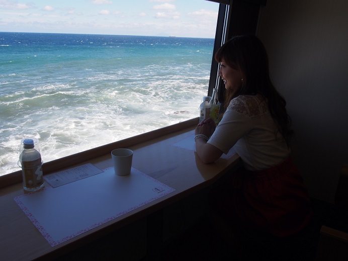 伊豆急行線って眺望が自慢ですが、わざと窓が小さくなってるのは、景色よりも車内の雰囲気や食事を楽しむための列車なのかなって勝手に思ったりしました。