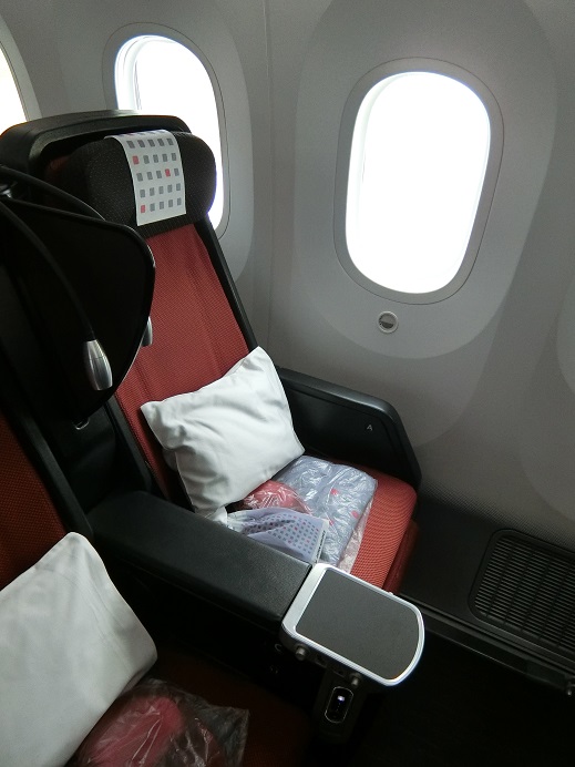 今回の座席。プラチナクラスは、落ち着いた雰囲気に設計されていて、側窓には、組子細工が施されています。