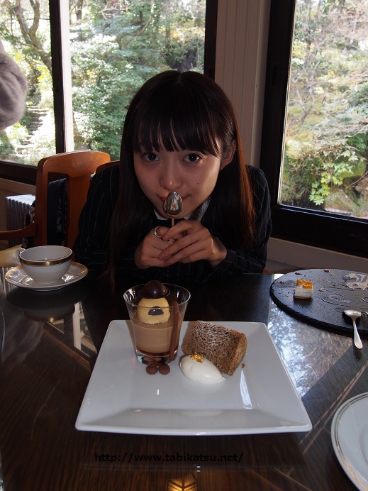 もうすぐ春、箱根へ・・・⑤宮ノ下「ラウンジ・オーキッド」 茅ヶ崎営業所の榎本です。 箱根宮ノ下にスポットを当てた今回。 引き続き、モデルはHAKONe女子倶楽部の「相澤香純」さんです。 「富士屋ホテル」での昼食を終えたのですが、もう少しホテル内で。 客室に続く階段の彫刻もレッドカーペットも眩しいです。 次にやってきたのがすぐ隣の「ラウンジ・オーキッド」。 スミマセンが、混雑のために全体の写真撮れませんでした。 50席程度の日本庭園を眺められるティーラウンジ。 ここで、毎度恒例の2017年4月9日まで開催されている 「箱根スイーツコレクション」。 今回のテーマは、「おいしい春へ出発進行!!箱根の乗り物スイーツ」。 こちらでは、「箱根周遊」。拡大写真がコチラ。 ホテルからバスで出発。駒ケ岳・芦ノ湖・明星ヶ岳や金時山などに見立てた苺やベリーを湾プレートに乗せ、BUSのスペルは、苺のタルト・キャラメル風味のバナナチョコレート・マンゴーレアチーズ 意外にボリュームがありそうで、なかったので、食後のデザートに程良い感じ。 スイーツ単品で1000円。食べる価値はあると思います。 メニューで気になってたスイーツを追加注文。 その名も「CHAPLIN'S PUDDING」。 多分・髭のつもりでポーズをとってるかと・・・・。 メニューを見たときからずっと気になってたんです・・。 これの由来が、昭和7年に宿泊したチャップリン氏をモチーフにしたプリン。 胴体の部分が、チャップリンの母国イギリス伝統の紅茶「アールグレイ」の苦みが少し強いプリン。顔の部分は、バニラアイス。帽子と髭はチョコレート。 先に、アイスを食べてしまったのですが、プリンの苦みがあるので、バニラアイスと混ぜればちょうど良さそうです。 その名の通り「茶っプリン」です。遊び心があって面白い一品です。 そして食後は中庭を散策。 レトロなポスト(しかも現役)があったり・・・・・ 売店で購入すれば、池の錦鯉に餌をあげることも出来ます。 注:えさをあげてるふりをしてます。 あと1年で一時休館となってしまい、耐震工事でどれだけの変化があるかは分かりませんが、今のうちに訪れるのをオススメしたいところです。 こんな感じで富士屋ホテルの散策は終了・・・・・。 でも、もう少しだけ続きます。 乞うご期待を!! [0回]PR