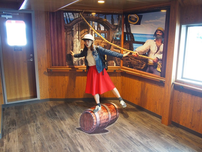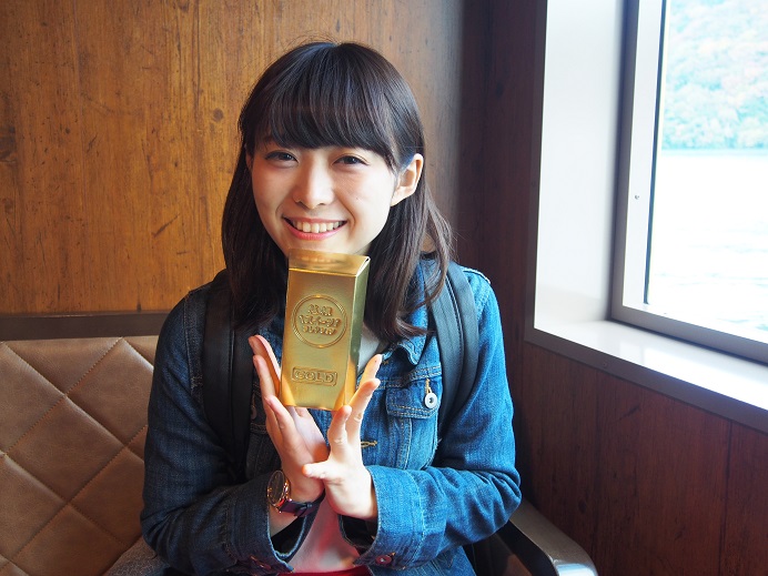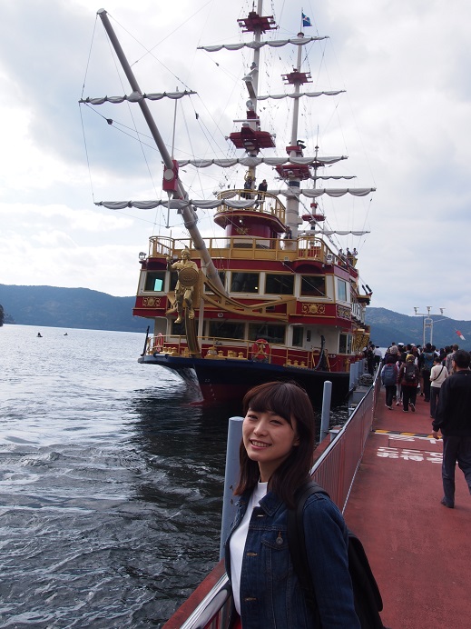 秋を感じに・・・箱根へ③元箱根~海賊船~桃源台港 毎度毎度・・・・茅ヶ崎営業所の榎本です。 10/16より茅ヶ崎営業所にて箱根応援キャンペーンがスタートしました。 詳細は、最後に告知しております。 まだまだ続きます!!箱根のお話。というか、小出しにしてスミマセン。 その分詳しく書かせていただきますので。 引き続き・・・・モデルは「HAKONe女子倶楽部」のリーダー 「相澤香純(あいざわかすみ)」さんです。 箱根湯本から一気に芦ノ湖(元箱根港)へ 天気は良かったのですが、残念ながら富士山は雲の中。見られませんでした・・・。 (写真は、映画ロマンスをイメージして・・・・・のつもり????) 映画の中でも富士山は見えませんでしたので、一緒ということで。OKでしょう。 元箱根港から桃源台港までの約30分間、芦ノ湖のクルーズ。 今回乗船したのは3隻のうちの「ロワイヤルⅡ」。 その他に「パーサ」「ビクトリー」という船が就航しています。 どれに乗れるかは運任せって感じです。 この時期はまだまだ寒くないので、秋風を感じながらデッキでクルーズを楽しむのがオススメです。 芦ノ湖周辺では、ところどころ紅葉が始まってきています。見ごろまで、あと数週間ってところですかね。 素晴らしい景色に見とれつつ・・・・・ 桃源台港が見えてきたところで、 忘れてたのが「スイーツコレクション」!!! 慌てて売店に買いに行って無事にGET!! 海賊船だからか、パッケージは金塊。 その金塊の中身はというと、「黒米とあずきのパウンド」。 桃源台港到着が近付いて慌てて食べる相澤さん。 ちなみに、海賊船の中で個人的に一番好きなのはこの「ロワイヤルⅡ」 1階の普通客室には、いくつかのトリックアートがありまして、こんな感じで面白写真を撮影することが出来るんです。 そんなこんなで約30分の芦ノ湖クルーズは終了しました。 箱根の話題はまだまだ続きます・・・・・・・。 ★★★★★★★★★★★★★★★★★★★★★★★★★★★★★★★★★ で、茅ヶ崎営業所の「箱根応援キャンペーン」の内容ですが・・・・ 10/16~11/30の間に箱根地区の宿泊をご来店の上、予約されたお客様。 合計金額、3万円につき500円のイオン商品券をプレゼント!! (オプショナルツアーはカウント対象外。お支払いは現金のみ) 宿泊対象日は~12/27までです。 さらに、日本旅行「赤い風船」のパンフレットからお申し込みの 大人の女性限定先着20名様には、 日本旅行特製「ハローキティ・ストラップ」 をプレゼントいたします!!!!!詳しくは店頭にて。 ★★★★★★★★★★★★★★★★★★★★★★★★★★★★★★★★ もしよろしければ、こちらも覗いてみてください。 今回ご協力いただきましたモデル「相澤香純(あいざわかすみ)」さんのブログ http://ameblo.jp/oto-heart/ 「HAKONe女子倶楽部」フェイスブック https://www.facebook.com/hakone.g7 [4回]PR